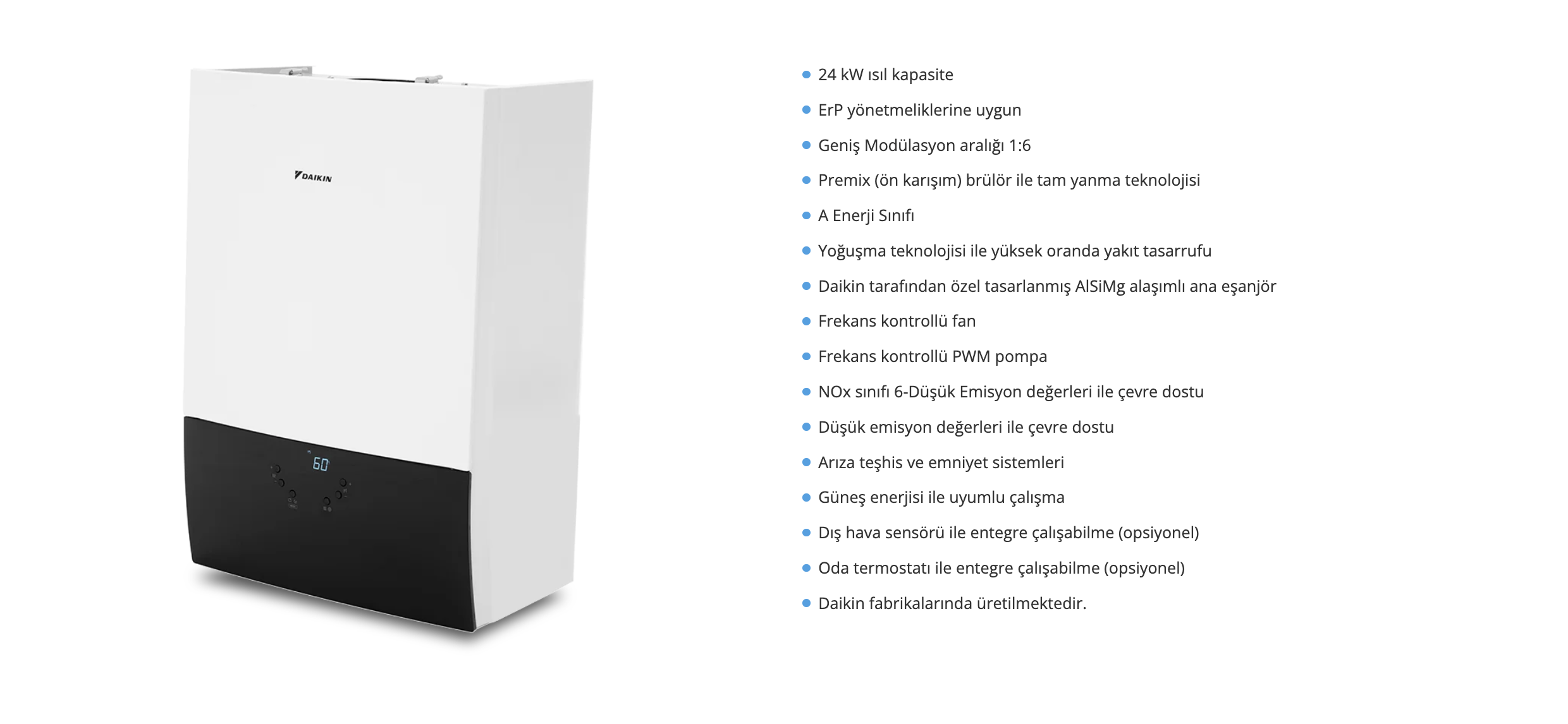 24 kW kapasiteye sahip olan Daikin CSU premix 1:6 geniş modülasyon aralığı ile rakiplerine göre öne çıkmakta olup, kullanıcısına tasarruf sağlamaktadır.