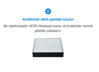 - Kolayca tıkanmayan, dolayısıyla düşük basınç kaybına neden olan yüksek performanslı elektrostatik HEPA filtre