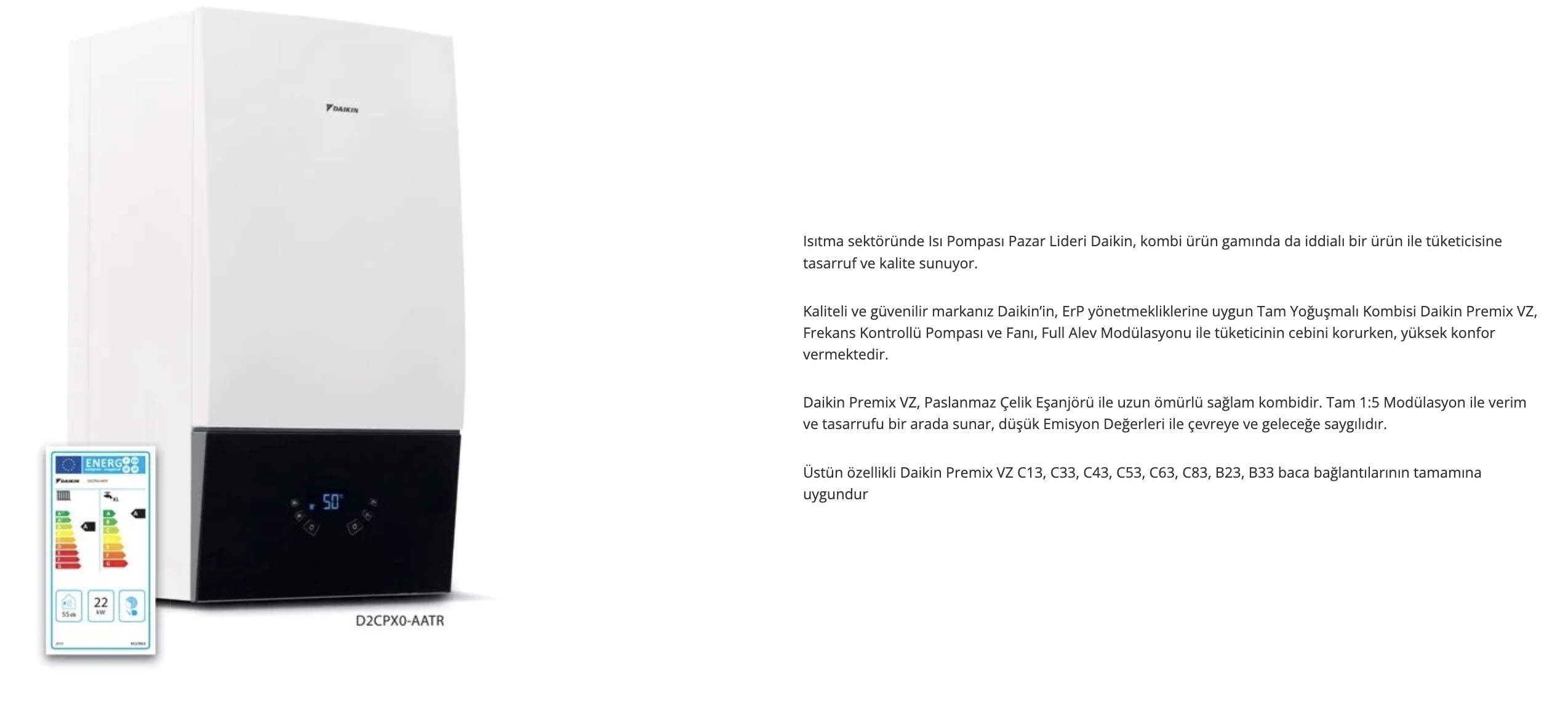 Daikin Premix VZ; Paslanmaz Çelik Esanjörü ile uzun ömürlü saglam kombidir. Tam 1:5 e kadar Modulasyon ile verim ve tasarrufu bir arada sunar, düşük Emisyon Değerleri ile çevreye ve geleceğe saygılıdır.