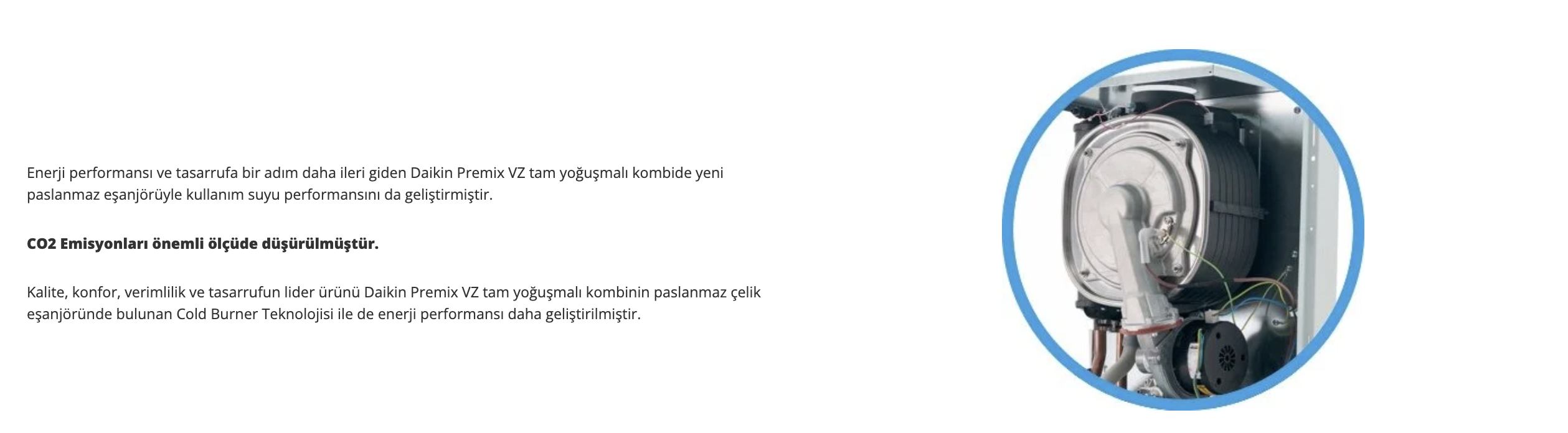 Kalite, konfor, verimlilik ve tasarrufun lider ürünü Daikin Premix VZ tam Yoğuşmalı kombinin paslanmaz çelik esanjöründe bulunan Cold Burner Teknolojisi ile de enerji performansı daha geliştirilmiştir.