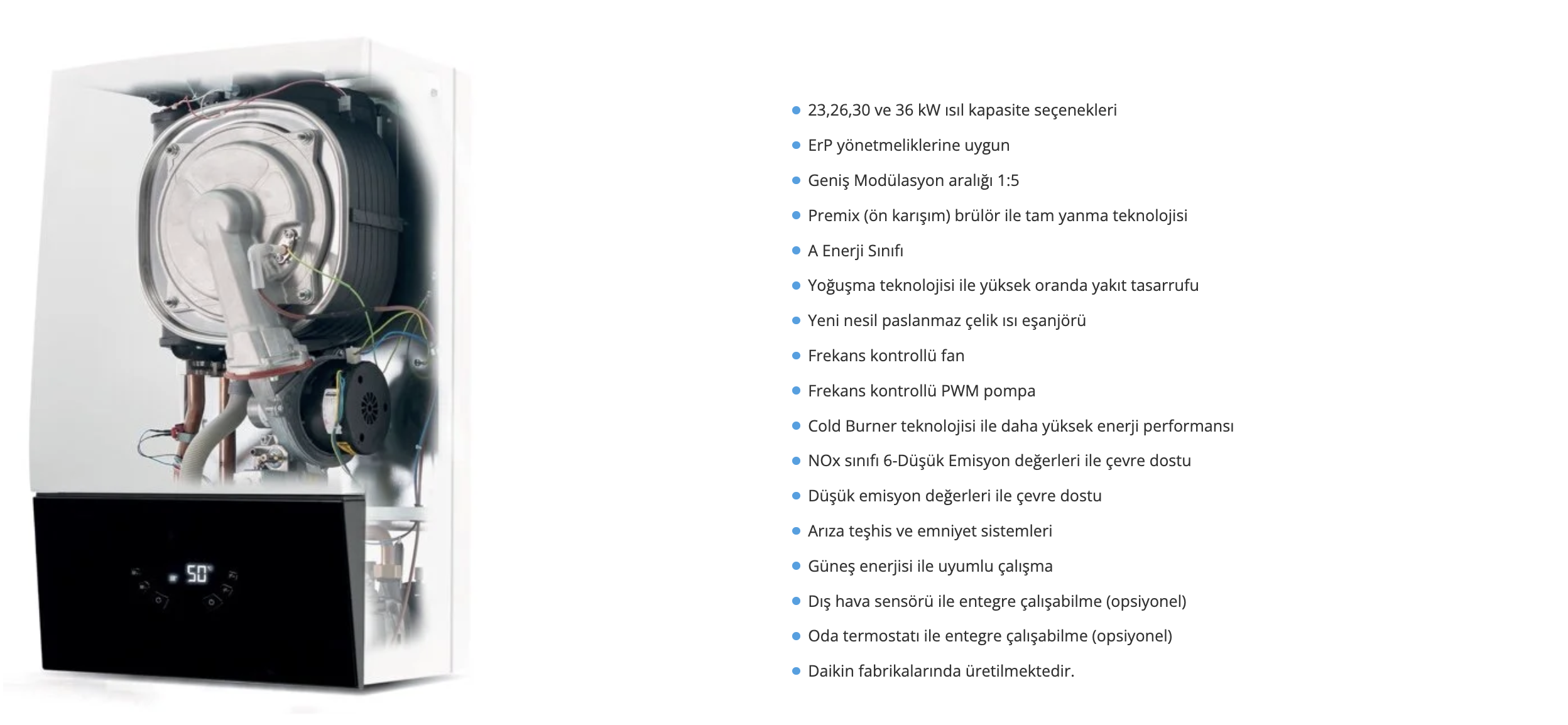 Kaliteli ve güvenilir markanız Daikin’in, ErP yönetmeliklerine uygun Tam Yoğuşmalı Kombisi Pompası ve Fanı, Full Alev Modülasyonu ile tüketicinin cebini korurken, yüksek konfor vermektedir.